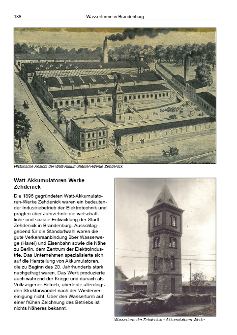 Brandenburg ist ein agrarisch geprägtes Flächenland mit geringer Bevölkerungsdichte. Abgesehen von Potsdam prägen kleinere Städte und zahlreiche ländliche Gemeinden das Bild. Viele errichteten nach 1900 eigene Wasserwerke mit Wasser-türmen; auch Gutshöfe, Krankenhäuser und militärische Anlagen waren darauf angewiesen. Wassertürme für Industrie, Schlachthöfe oder Gaswerke sind dagegen selten. Die Eisenbahn